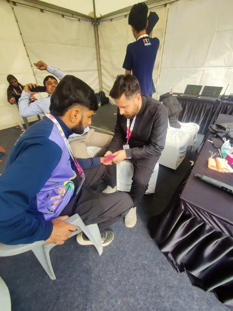Students of the BPT Department, University of Engineering & Management (UEM), Jaipur, continued their advanced clinical training on Day 2 of the Khelo India University Games 2025 under the expert supervision of Dr. Imran Khan, State Physiotherapy Official.