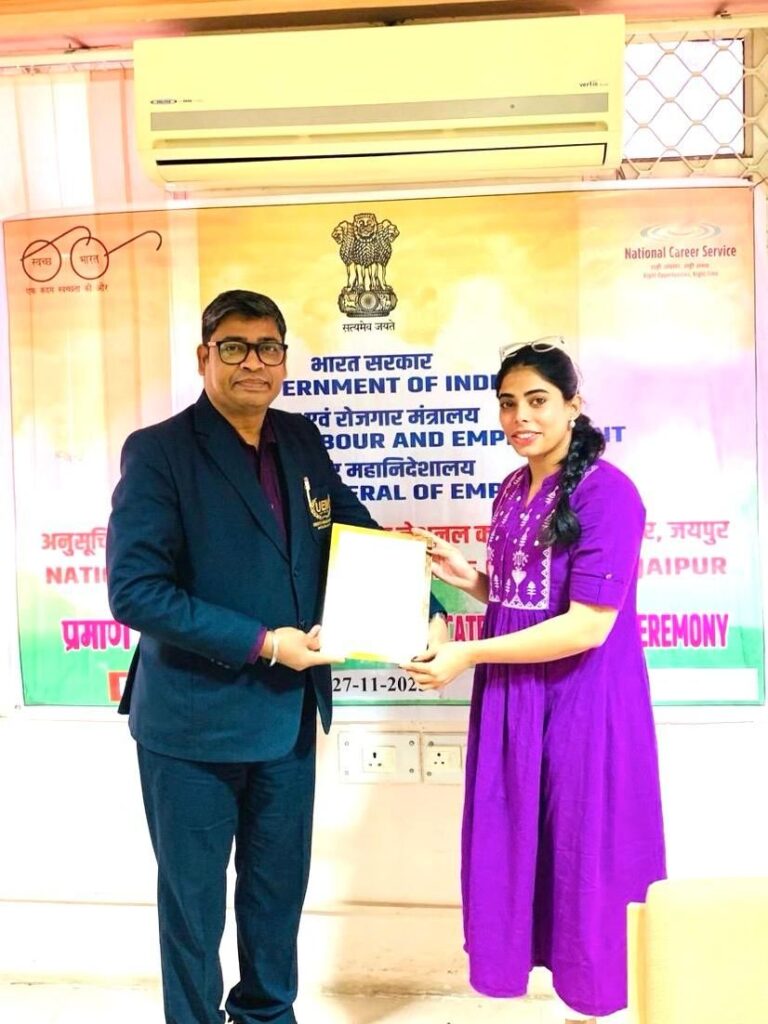 University of Engineering & Management (UEM), Jaipur is pleased to share that on 27th November 2025, Mr. Sankar Sing, Deputy Director – Corporate Relations, was invited by the Directorate General of Employment (NCSC), Ministry of Labour and Employment, Government of India, to represent the university at the Certificate Distribution Ceremony for trainees who successfully completed their training under the department.