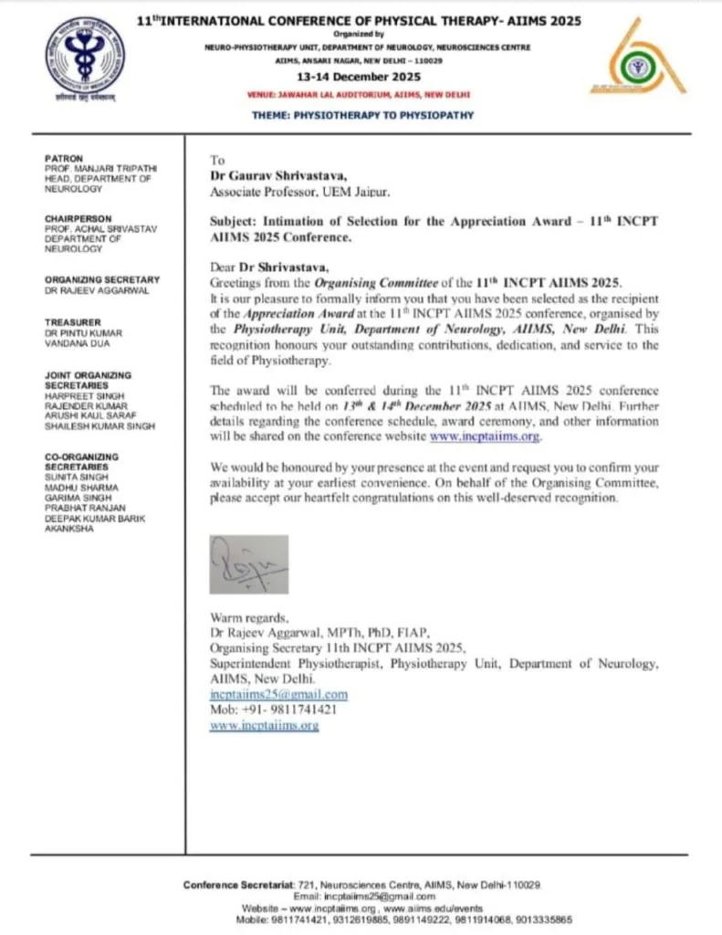 University of Engineering & Management (UEM), Jaipur proudly celebrates the achievement of Dr. Gaurav Shrivastava, Associate Professor, Department of Physiotherapy, who has been conferred with the Prestigious Appreciation Award at INCPT 2025, held at the iconic Jawaharlal Nehru (JLN) Auditorium, AIIMS, New Delhi, on 14–15 December 2025.