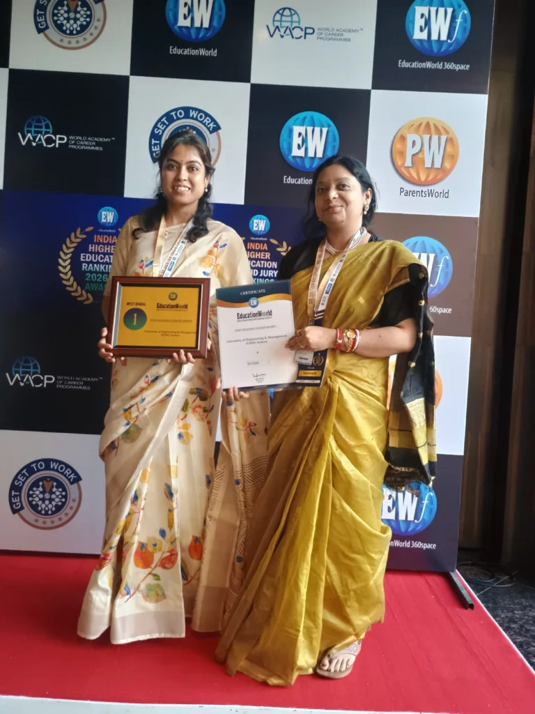 University of Engineering and Management, Kolkata is ranked 1st in West Bengal in the EducationWorld India Higher Education Rankings 2026-27 (EWIHER) under the category Private Engineering & Technology Universities based on an extensive evaluation process, including field interviews with over 2,100 well-informed stakeholders from the higher education sector across the country.